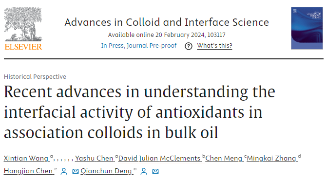 导读:2024年2月,yl6809永利集团陈洪建博士作为第一通讯作者在国际食品Top期刊《Advances in Colloid and Interface Science》(Q1,IF: 15.6)发表题为“Recent advances in understanding the interfacial activity of antioxidants in association colloids in bulk oil”的综述论文。中国农业科学院油料作物研究所博士研究生王新天为第一作者,通讯作者为yl6809永利集团陈洪建特任副研究员和中国农业科学院油料作物研究所邓乾春研究员。